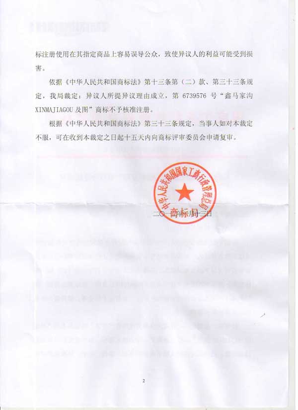 “鑫馬家溝x(chóng)inmajiagou及圖”商標(biāo)異議裁定書(shū)