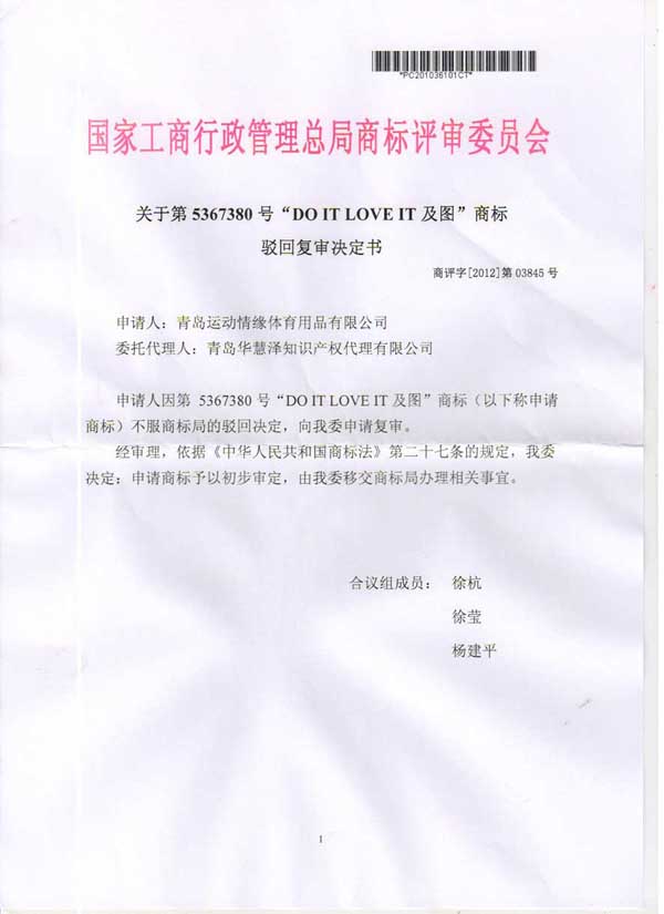 關于第5367380號“DOITLOVEIT及圖”商標駁回復審決定書