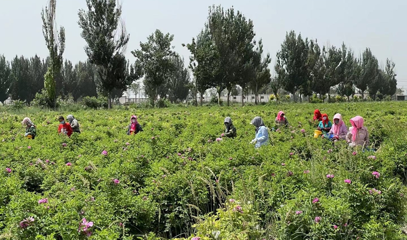 圖為寧夏嘉禾花語(yǔ)生態(tài)農(nóng)業(yè)合作社的農(nóng)戶在采摘玫瑰花蕾。 李珮 攝