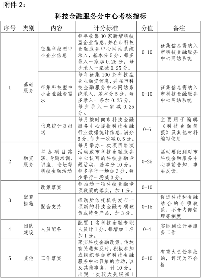 市科技金融服務(wù)中心負(fù)責(zé)對列入試點的各科技金融服務(wù)分中心組織考核,每年一次。