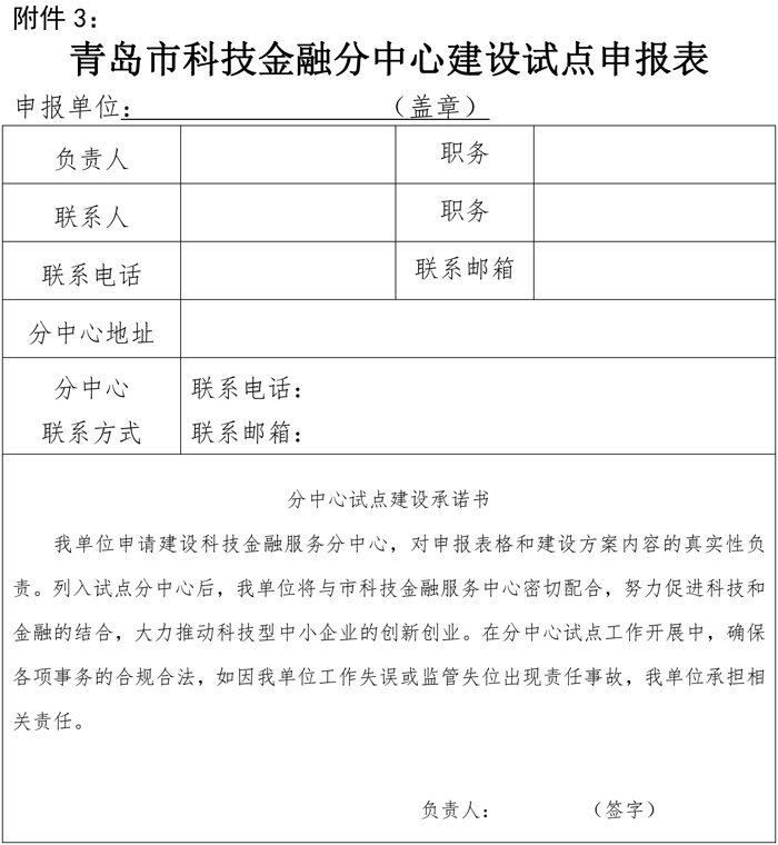 四、申報主體填寫《青島市科技金融分中心建設(shè)試點申報表》(見附件3)并提供分中心試點建設(shè)方案(包括但不限于場地設(shè)施、團隊建設(shè)、制度建設(shè)、工作開展方案、配套政策措施等內(nèi)容,可對照附件2相關(guān)內(nèi)容)及相關(guān)附件材料(各類證明材料等),于2017年3月20日之前將申請材料(紙質(zhì)共一式兩份)和電子文檔分別報至我中心。